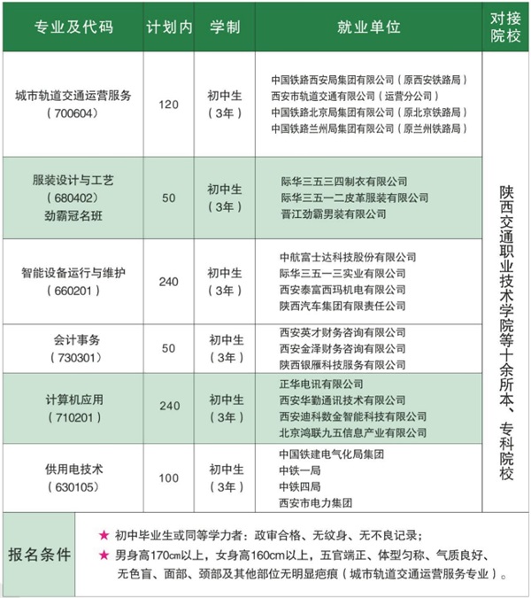 學校開設城市軌道交通運營服務、服裝設計與工藝、智能設備運行與維護、會計事務、計算機應用、供用電技術六大社會剛性需求專業(yè)。學生畢業(yè)后,符合條件者可參加職業(yè)教育單獨招生考試,進入統(tǒng)招大;虮究圃盒>妥x;或頒發(fā)統(tǒng)招中專文憑,發(fā)放派遣證,送入對應企業(yè)工作。